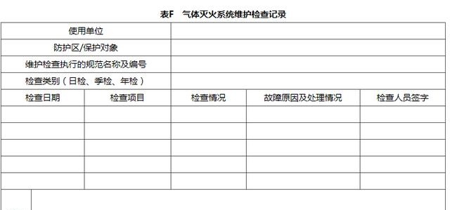 應按檢查類別規(guī)定對氣體滅火系統(tǒng)進行檢查,并按本規(guī)范表F做好檢查記錄。檢查中發(fā)現(xiàn)的問題應及時處理。